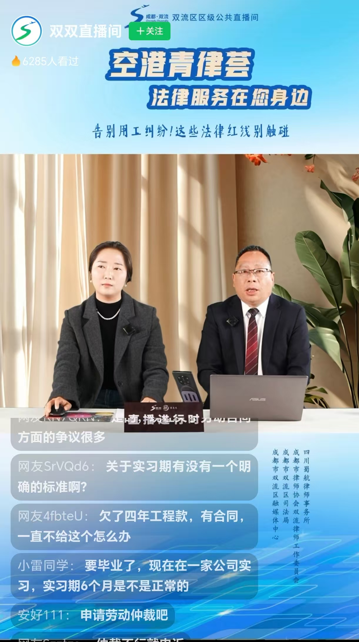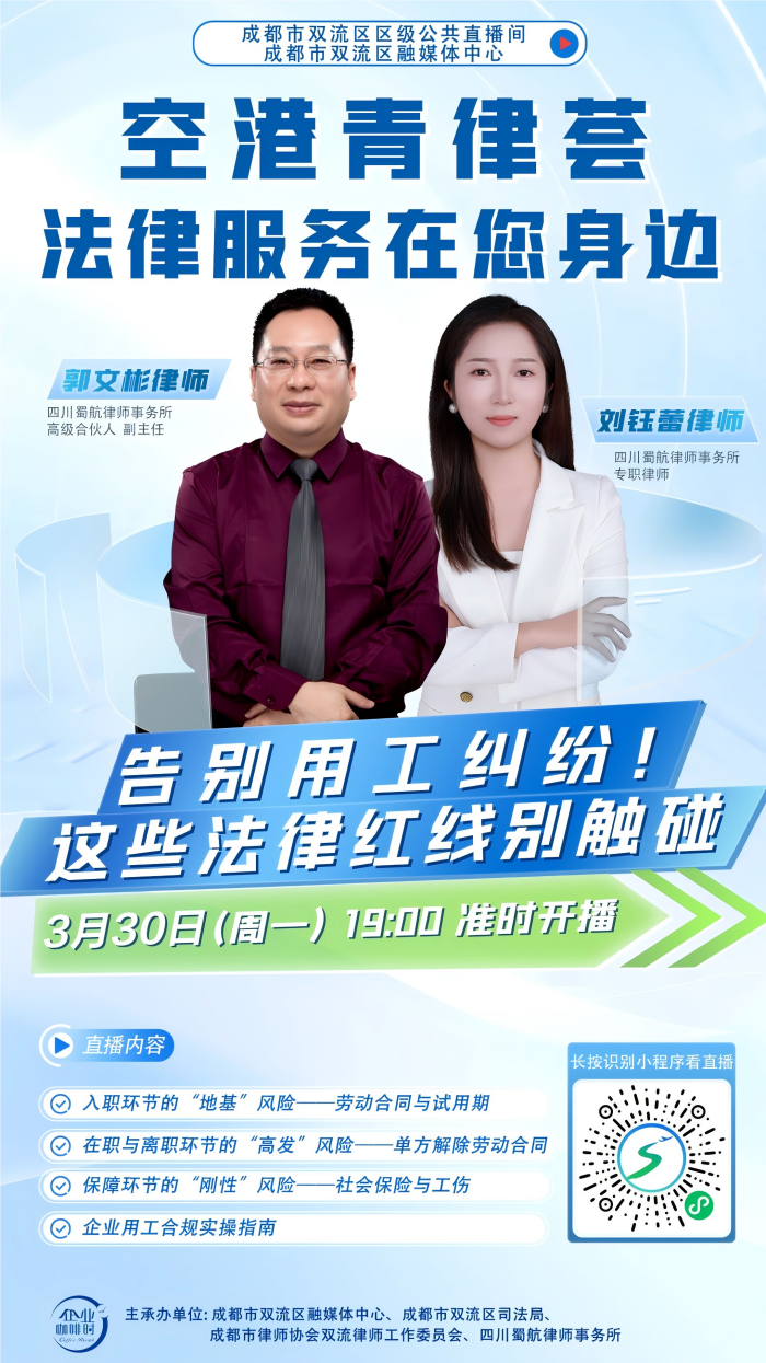 2026年3月30日,四川蜀航律师事务所高级合伙人、副主任郭文彬律师和专职律师刘钰蕾受邀进入由成都市双流区司法局、成都市双流区融媒体中心、成都市律师协会双流律师工作委员会及四川蜀航律师事务所联合主办的“空港青律荟·法律服务在您身边”的直播间,争对企业常见的用工风险,开展了“告别用工纠纷!这些法律红线别触碰 ”专栏的普法直播宣传活动。
